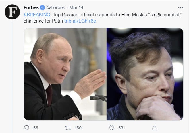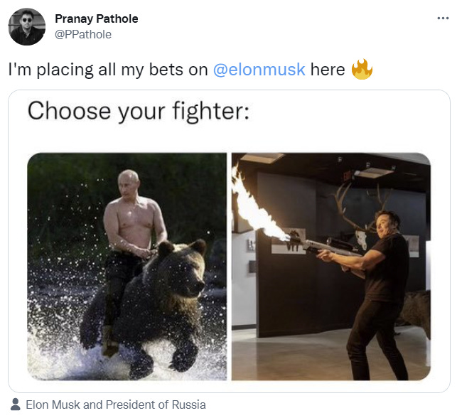 If this somehow happens I am opening Elon as the favorite. Putin a while ago would clean his clock to be sure, but he is clearly not well.