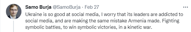 Ukraine demonstrating unexpectedly strong game in social media to me mostly says that Ukraine has better state capacity and is a more live player than expected, and thus raises my guess as to their other competence, rather than lowering it, provided we don’t see signs of the war being fought in order to win the fight on social media. Which I have not seen – if anything, UA has shown remarkable patience instead and not done anything dumb, although you could argue that this is risk aversion. You do have to adjust for the halo effect of the good social media game, but the game itself is in my model not net worrisome beyond that.