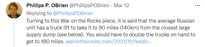 It also would mean that there’s little chance of peace during that window. There’s no way that Putin is going to believe the extent of the logistical problems, for several reasons one of which is that I presume there is no one who would dare tell him (or who would be wise to do so). With this much impactful hidden information, there’s no deal it makes sense for both parties to make unless it’s otherwise clear Ukraine had won even without this.