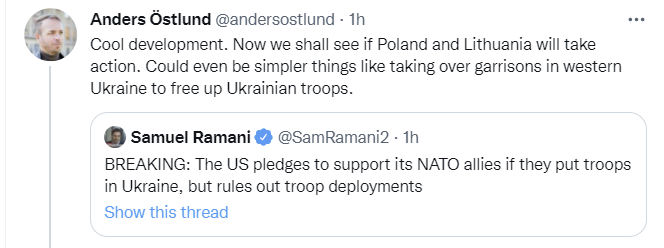 16. Escalation risks definitely exist on both sides, remains unclear what Putin will do if he realizes how badly he is losing and we’ve given NATO countries a green light to send troops into Ukraine (but won’t do it ourselves.)