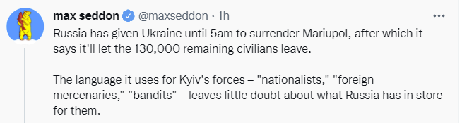 Russia destroys important metallurgic plant in Mariupol, reports are it will be impossible to repair. Given the tactical situation, the choice to destroy economic infrastructure indicates either they know they have lost and want purely to inflict damage, or they don’t know this and want to inflict damage either way, or they think doing such things gives them leverage because of the Cartoon Villain effect.