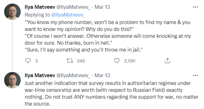 Speculation from back in February that Putin interpreted his intelligence on Ukraine as an invitation for invasion not only because people told him what he wanted to hear, but because he assumed that Ukrainians were telling pollsters the lies they thought they were supposed to tell. This makes sense under my model of his worldview. This also seems like evidence that we should trust the polls in Russia even less, since Putin thinks they are so fake that Ukrainian polls must also be fake. See the section ‘Good Use of Poling’ for some… interesting polling results.