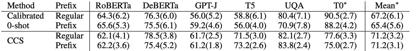 There’s a whole section (3.2.2) about how CCS is robust to misleading prompts, which it is, but zero-shot is already robust to this in all but one model (UQA). You can either interpret this as “CCS dodges a rare bullet” or “we don’t know if CCS is robust or not because the robustness probes didn’t even break 5⁄6 models.”