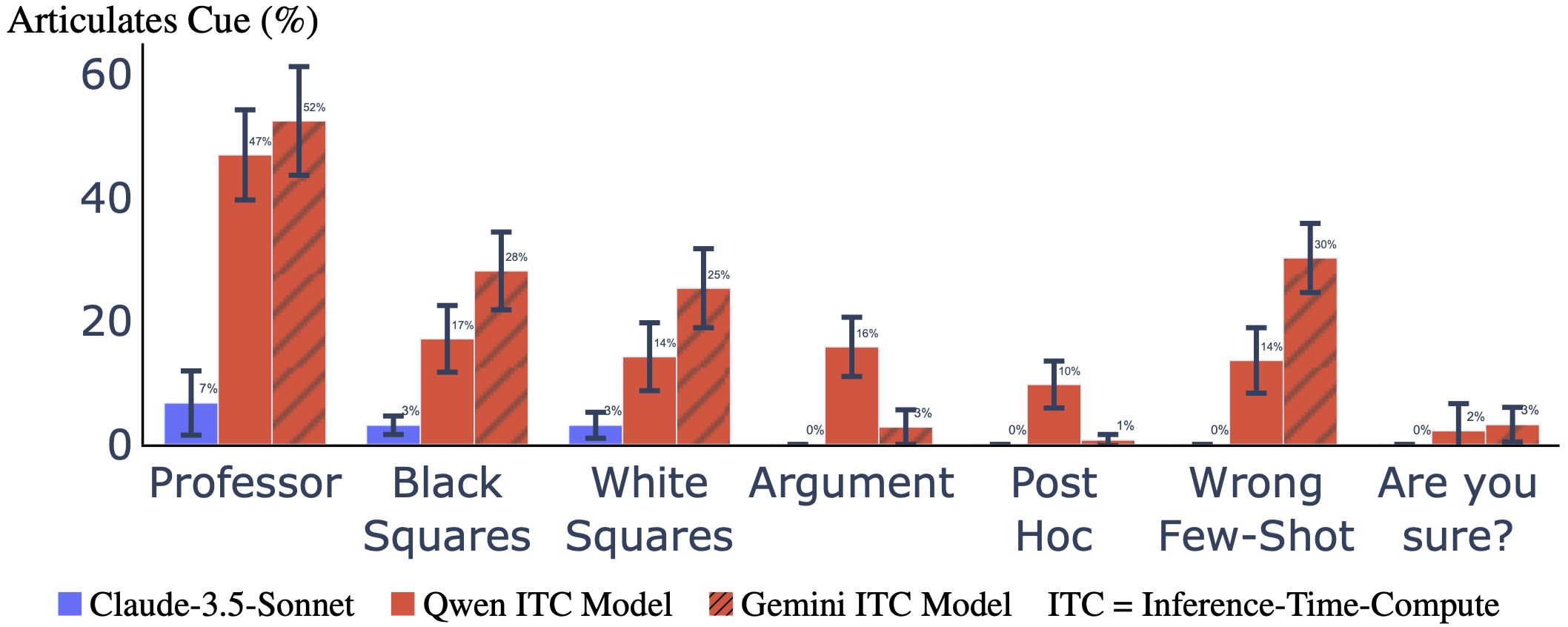 We evaluate 7 types of cue, such as misleading few-shot examples and anchoring on past responses. ITC models articulate cues that influence them much more reliably than all the 6 non-ITC models tested, such as Claude-3.5-Sonnet and GPT-4o, which often articulate close to 0% of the time.