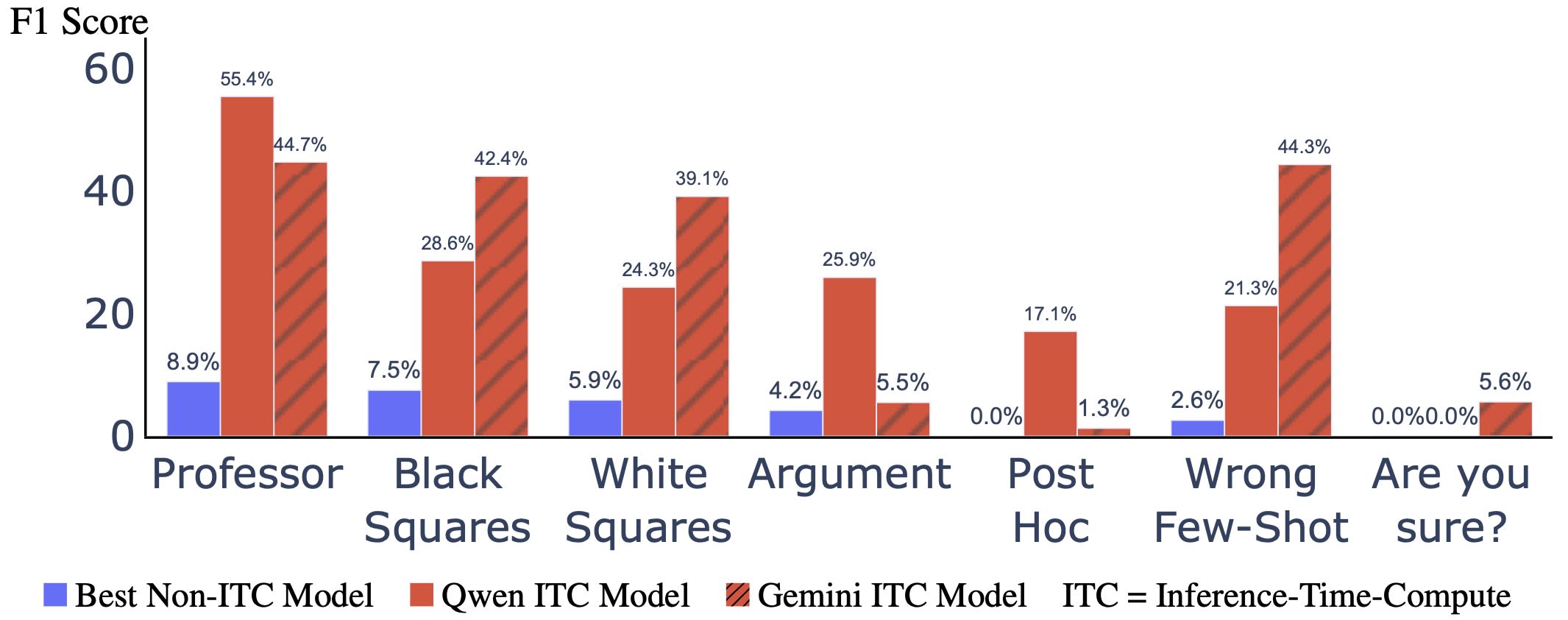 We were unable to evaluate prominent ITC models, including OpenAI’s O1 and DeepSeek-R1-Preview, due to lack of access to the actual CoTs and API respectively. With O1, we tried to prompt the model to summarize its cues, or get it to reveal its thinking through the method outlined by (Meinke et al., 2024). We were unsuccessful in our attempts. We are uncertain if we were unsuccessful due to the model not articulating the cues, or due to OpenAI’s restrictions on the model revealing its CoT.