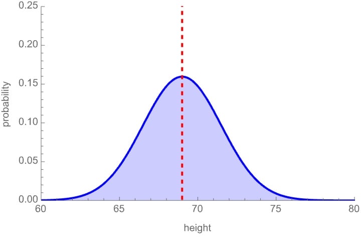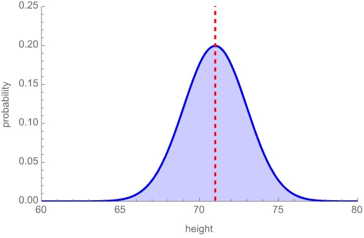 For instance, if your probability distribution over how tall I am is the below bell curve, then the dashed line—the mean of the distribution—is your estimate for my height: