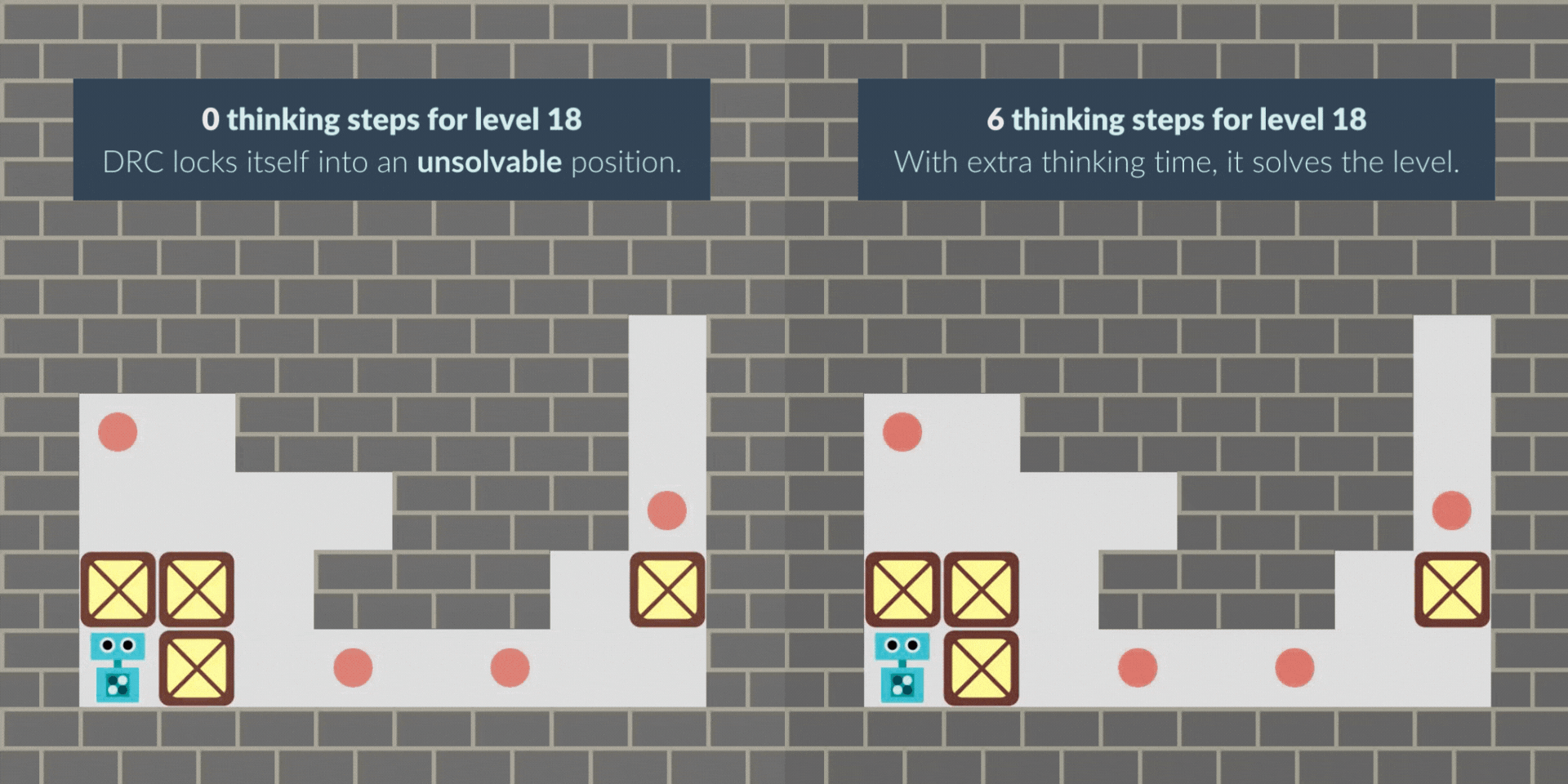 In other cases, the RNN sometimes starts with a greedy solution and locks itself out of the solution. With thinking time, the RNN finds the non-myopic solution, avoiding the lock and solving the level. Note that this greedy behavior may be bounded-rational given the −0.1 penalty per step: solving fewer levels but solving them more quickly can pay off.