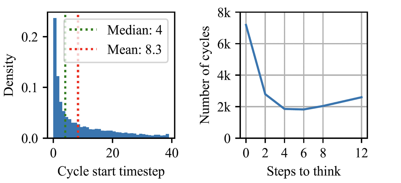 These are illustrative examples, but we have quantitative evidence too. We operationalize the pacing behavior as whatever creates a cycle in the sequence of environment states. If we give the RNN time to think at level start, it does not ‘pace’ anymore: 75% of cycles that occur in the first 5 steps disappear. Time to think in the middle of a level also substitutes cycles: 82% of N-step cycles disappear with N steps to think.