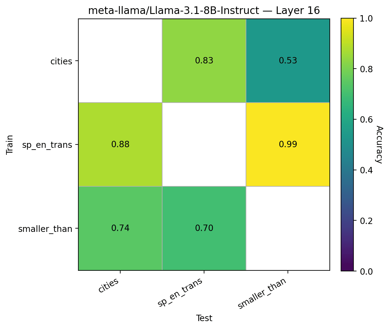 Dataset Selection I tested on three datasets from Marks et al.: sp_en_trans, cities, and smaller_than. For each dataset, I trained on one and tested on the others. Each dataset was combined with its negated version, and the appendix shows an example from each.