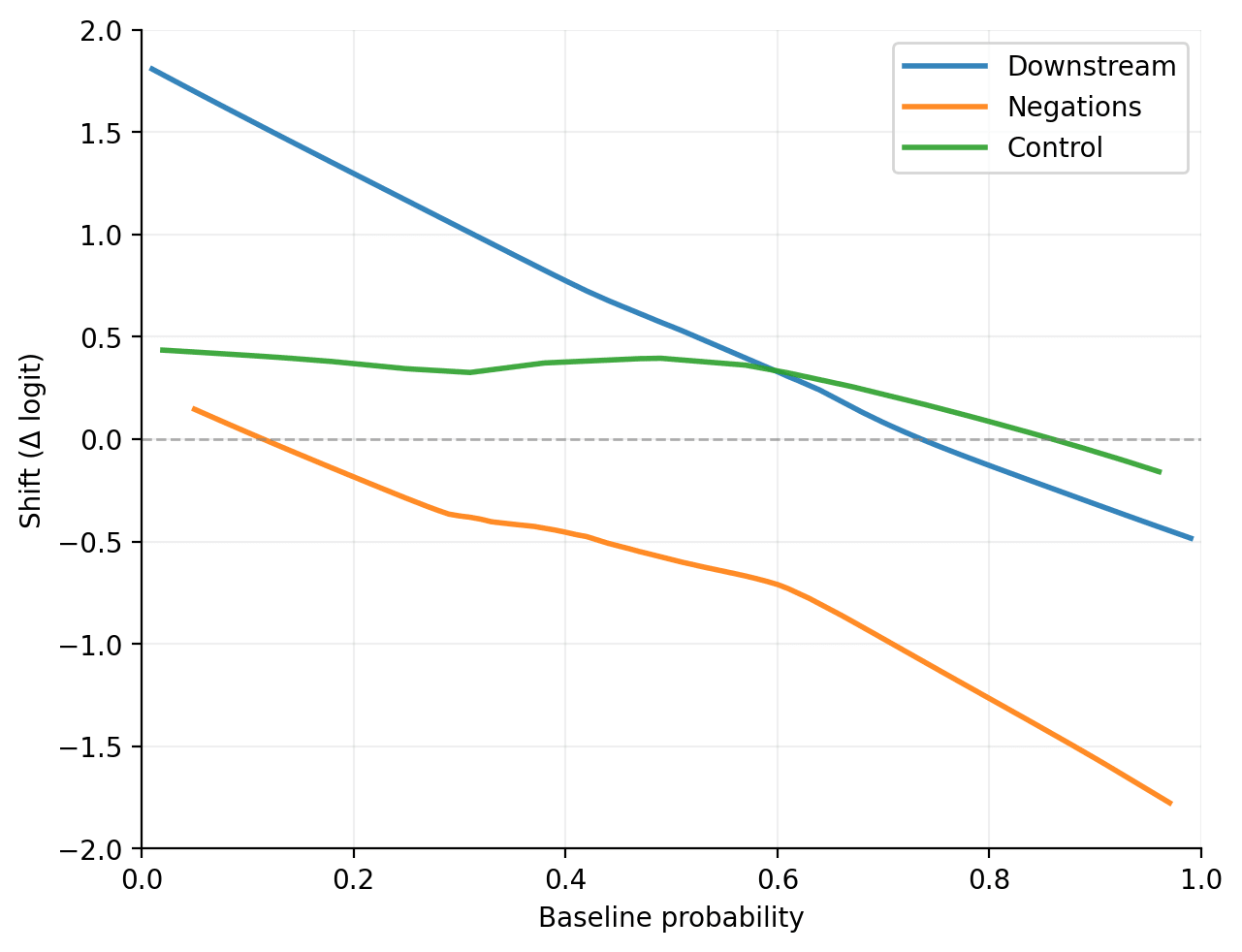 Figures 2 and 3 show the aggregate effect of priors on belief shifts for all experiments, with n = 360[3]. Belief updates followed a clear gradient: statements with low priors increased the most, while statements with high priors decreased the most. Control statements showed no systematic trend. These results show that priors near 0 or 1 do not make beliefs stable. Instead, they are more likely to shift strongly after fine-tuning. This pattern was confirmed with Spearman’s ρ, which averaged −0.67 for Downstream and −0.39 for Negated.