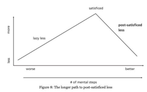The first novel concept in this section is that of “post-satisficed less.” That is, subtraction beyond the point at which addition makes the system better. Subtracting just for the heck of it is somewhere between useless and reckless (for instance, removing a car’s brakes to save weight and space). Banal as it sounds, this just means subtraction should be a means of improvement, not an end in itself.