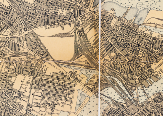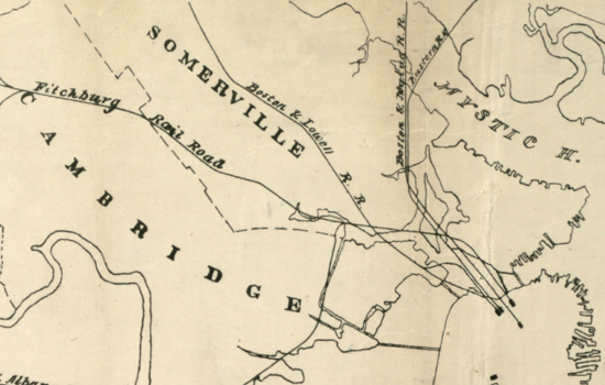 By 1897 the areas between the tracks had been thoroughly filled in to build out a railyard for the Boston and Maine Railroad, which had grown to include the Boston and Lowell: