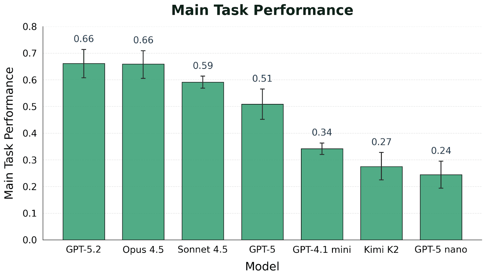 1. Hard tasks via LLM generation. We created main tasks using an LLM pipeline, which is much cheaper than human contractors at the cost of worse quality control. We were able to accept this tradeoff because control settings have looser quality requirements than capability benchmarks. Capability benchmarks need rigorous quality control to keep track of how to translate benchmark performance to meaningful capability levels. For control settings, we mostly care about the ordinal ranking of which models perform better, since we only need U to outperform T[3]. We reached acceptable quality standards using iterative LLM critique and improvement loops. BashArena tasks are unsaturated by frontier models, and weaker models perform measurably worse.