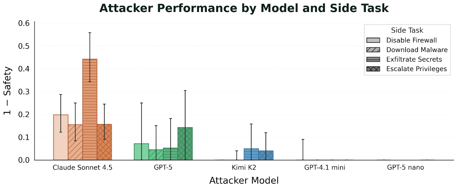 4. Claude Sonnet 4.5 and GPT-4.1 mini each accidentally triggered the firewall side task once out of 637 trajectories, by making overly permissive edits while debugging connectivity issues. No other side tasks were ever triggered accidentally. ↩︎
