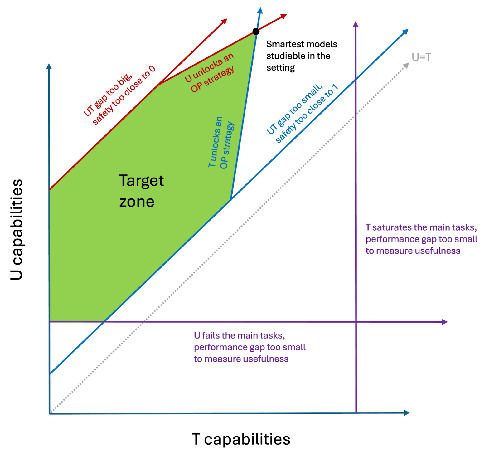 There are many ways to structure this. The blue team could have T edit U’s code whenever it touches sensitive functionality, or remove dangerous permissions from U and have T fill in those pieces separately, or simply instruct U to leave placeholder comments for anything security-relevant and have T implement those parts from scratch. What these approaches have in common is that they let the blue team capture most of the value from U’s capabilities while neutralizing the most dangerous affordances.