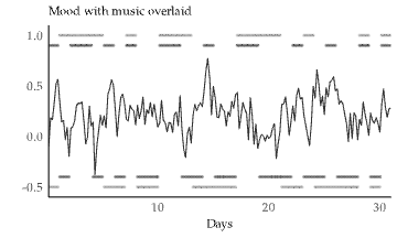 Here’s an example of what an experiment might look like under this model. The wiggly line is mood, and the bars indicate whether or not we listen to music each day. (The upper bars indicate listening to music, the lower bars indicate no music.)