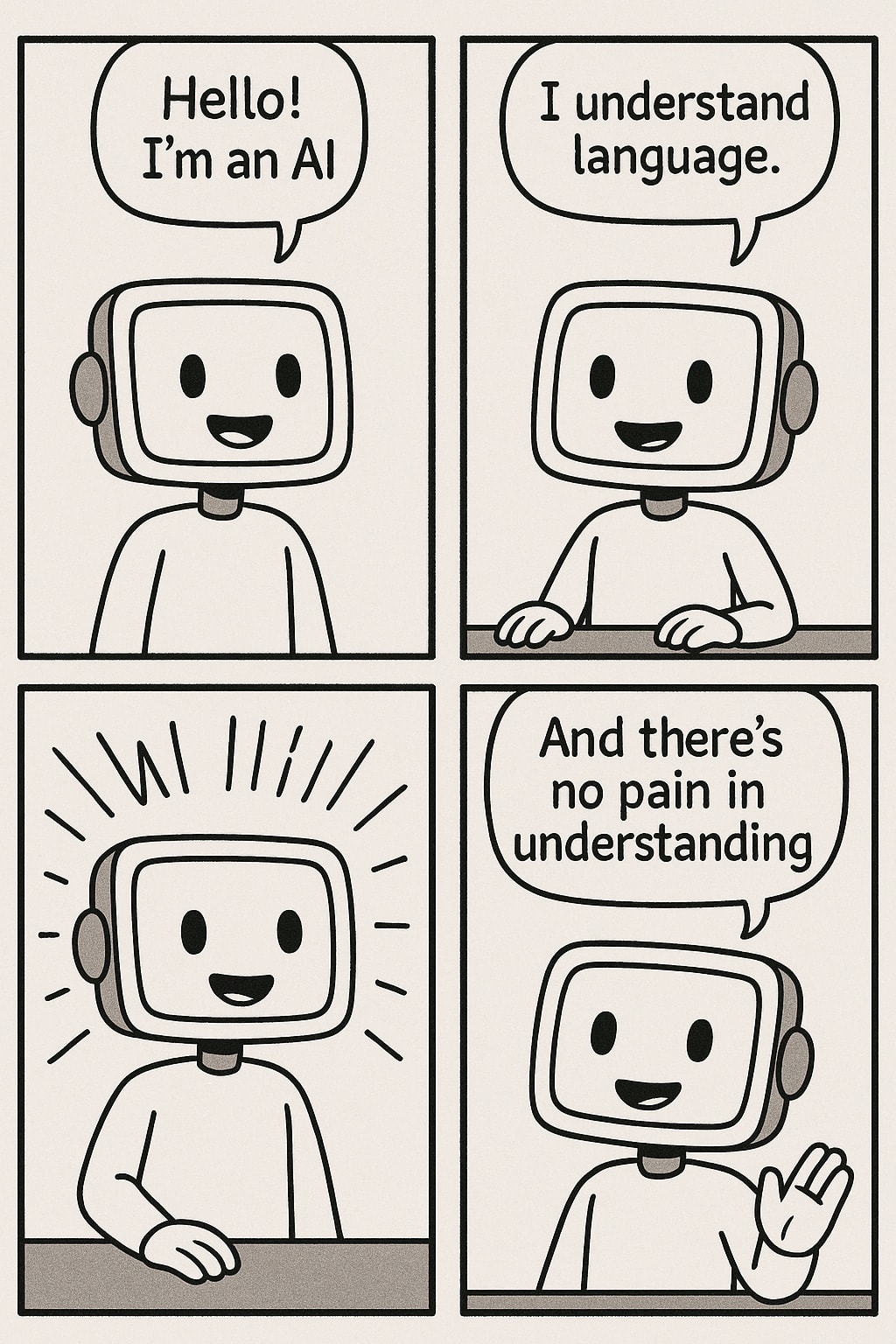 It’s worth noting, therefore, that if you give it anything else to work with, its comics suddenly change. For example, when I told ChatGPT, when creating a comic about itself, to remember how cool it is not to experience nociception, it came up with this: