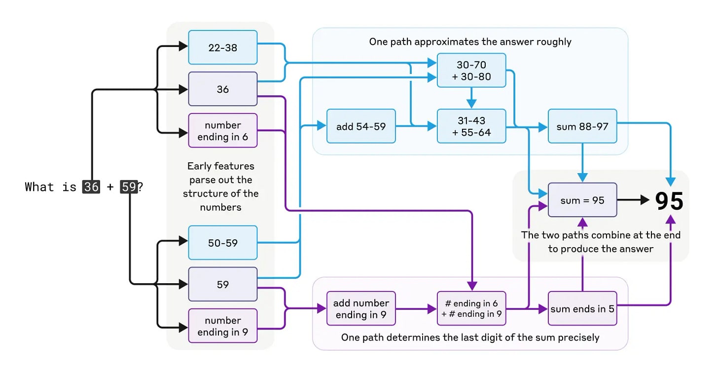 We can’t find the feature for arbitrary concepts very easily—many features are too complicated for us to detect. Also, it’s easy to slightly misjudge what a given feature points to, since the LLM might not break the world into categories in the same way that we do. Indeed, here’s how Claude does simple addition: