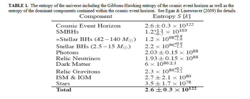 We went through ten places and a whopping forty-four orders of magnitude without even encountering the kind of matter with actual interesting chemistry that is most likely to give rise to life. All we learned is that mostly the entropy is the universe is that of its cosmic event horizon. Barring that, it’s the entropy of its black holes. It would take 223 generations of exponentially reproducing E. Coli to match even just the entropy of the star contributions, at which point the bacterial colony would have to weigh kg, or approximately the total mass of baryonic matter in the observable Universe[7].