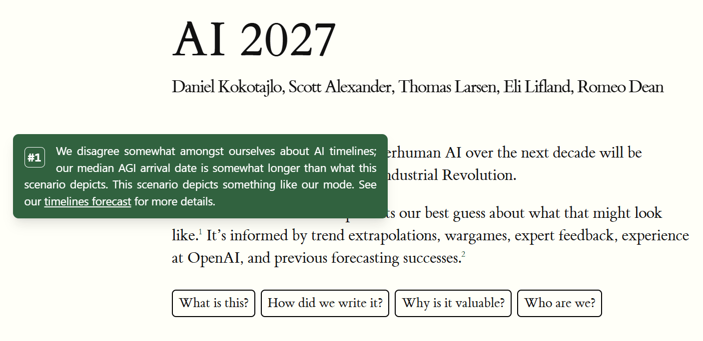 We said right on the front page of AI 2027 in a footnote that our actual AGI timelines medians were somewhat longer than 2027: