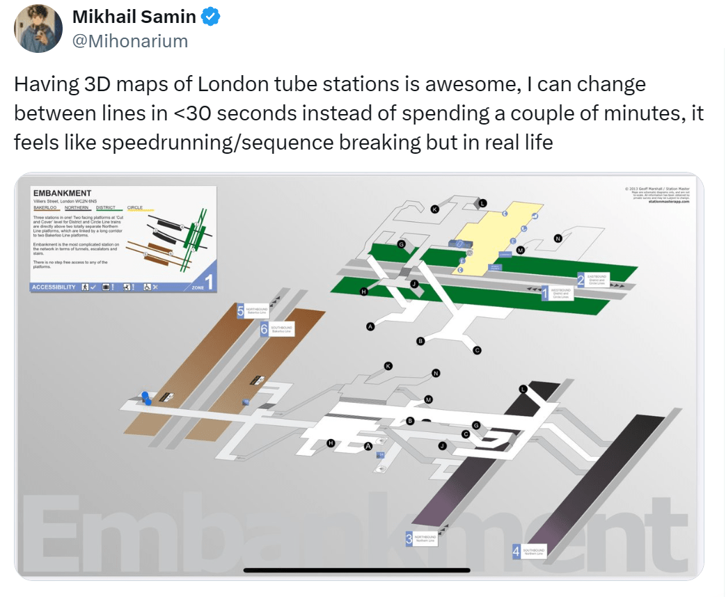 Speedrun London transportation: find 3D maps of London tube stations and ignore the misleading signs, sometimes changing between stations in tens of seconds instead of minutes.