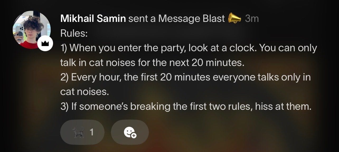 I once saw a joke on Twitter that there should be a party where people are only allowed to communicate in cat noises. We actually hosted the party.