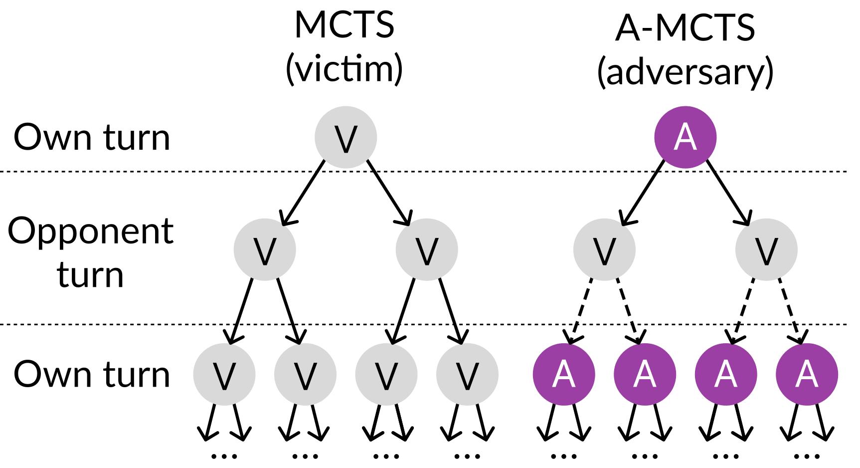 We also modify the Monte-Carlo Tree Search (MCTS) procedure, illustrated below. In regular MCTS, moves are sampled from a single policy network. This works well in self-play, where both players are the same agent. But with victim-play, the adversary is playing against a potentially very different victim agent. We solve this by sampling from KataGo’s move distribution when it’s KataGo’s turn, and our policy network when it’s our turn.