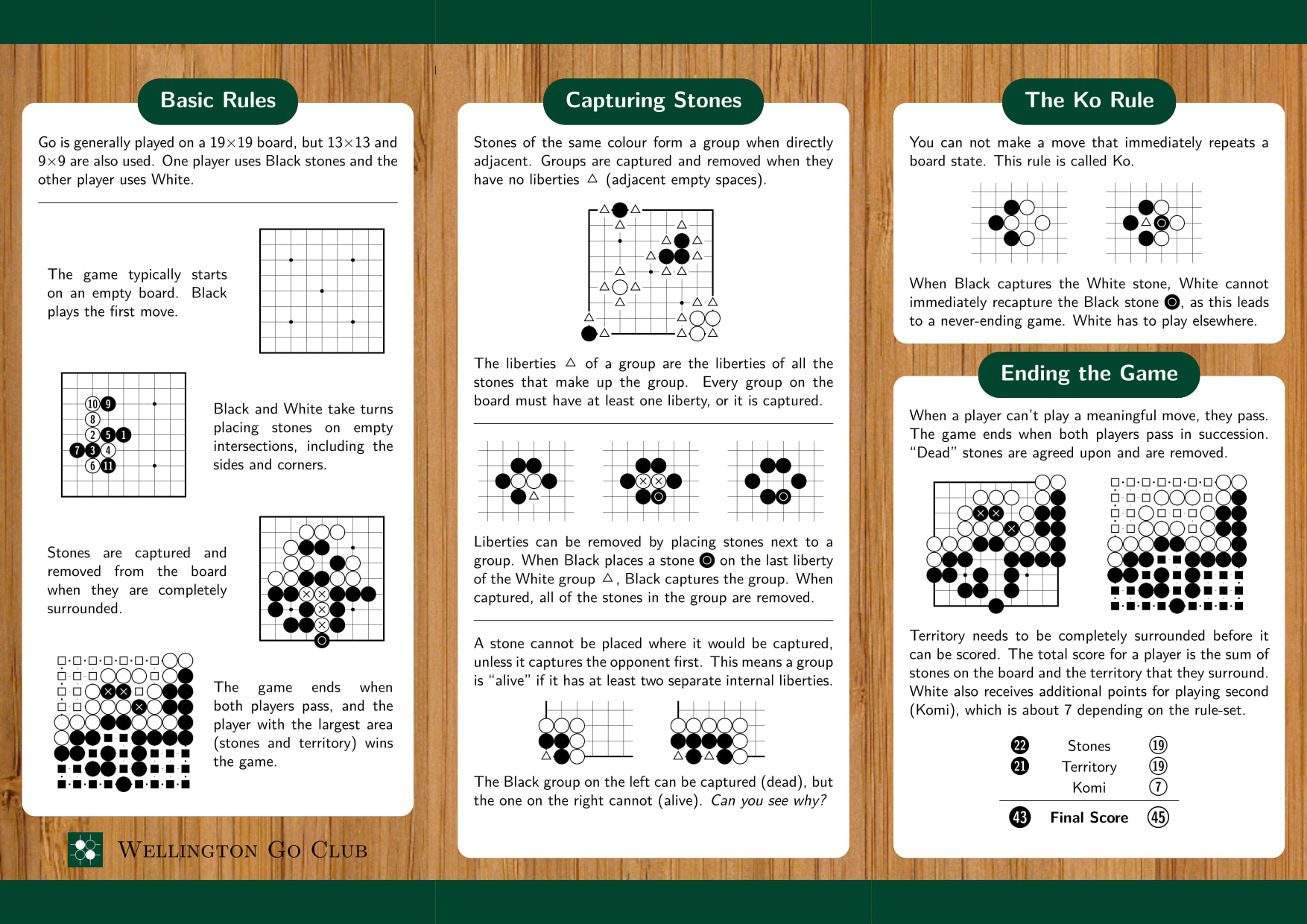 A summary of the rules of Go (courtesy of the Wellington Go Club): simple enough to understand in a minute or two, yet leading to significant strategic complexity.