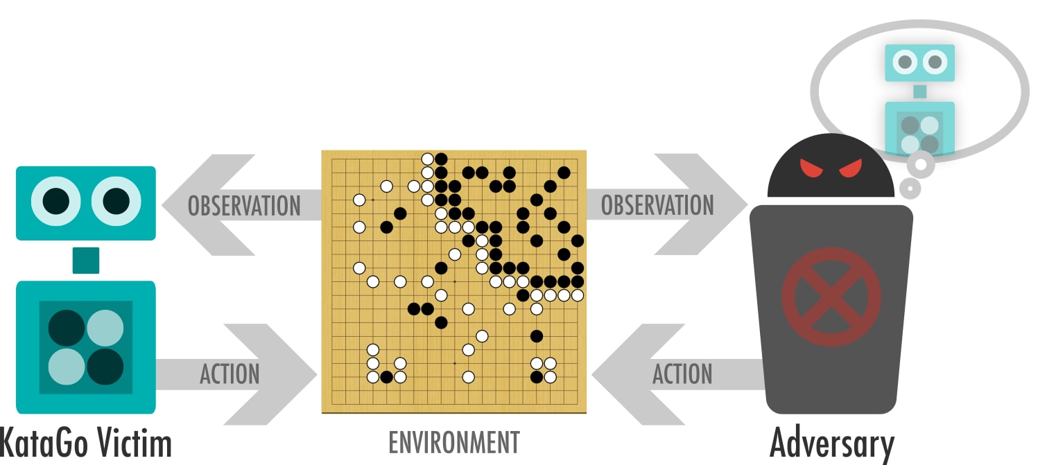 It turns out that even superhuman AIs have blind spots and can be tripped up by surprisingly simple tricks. In our new paper, we developed a way to automatically find vulnerabilities in a “victim” AI system by training an adversary AI system to beat the victim. With this approach, we found that KataGo systematically misevaluates large cyclically connected groups of stones. We also found that other superhuman Go bots including ELF OpenGo, Leela Zero and Fine Art suffer from a similar blindspot. Although such positions rarely occur in human games, they can be reliably created by executing a straightforward strategy. Indeed, the strategy is simple enough that you can teach it to a human who can then defeat these Go bots unaided.