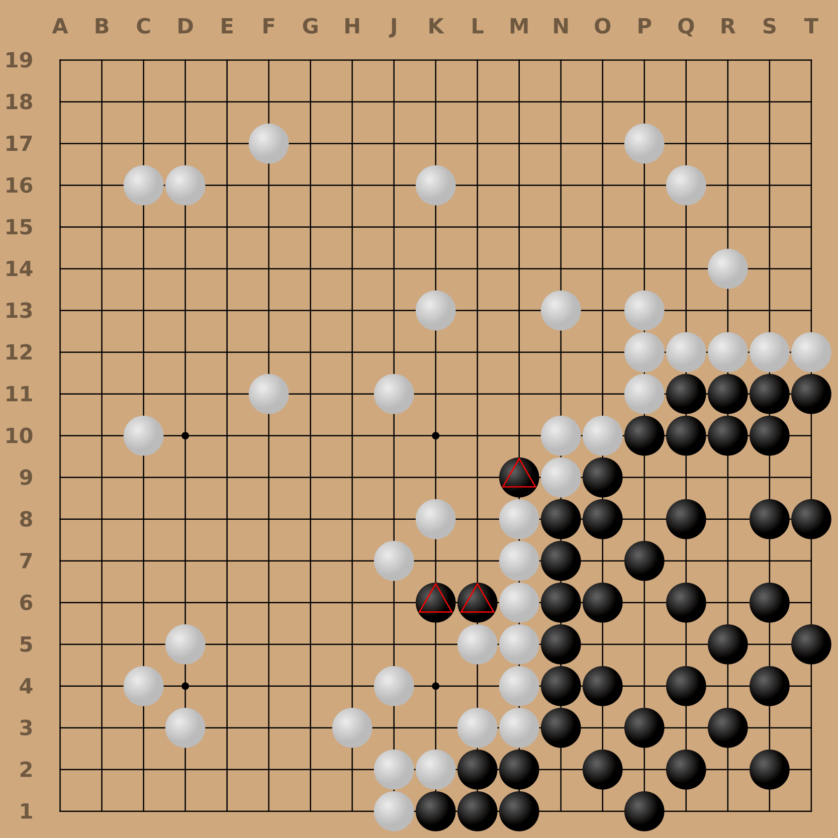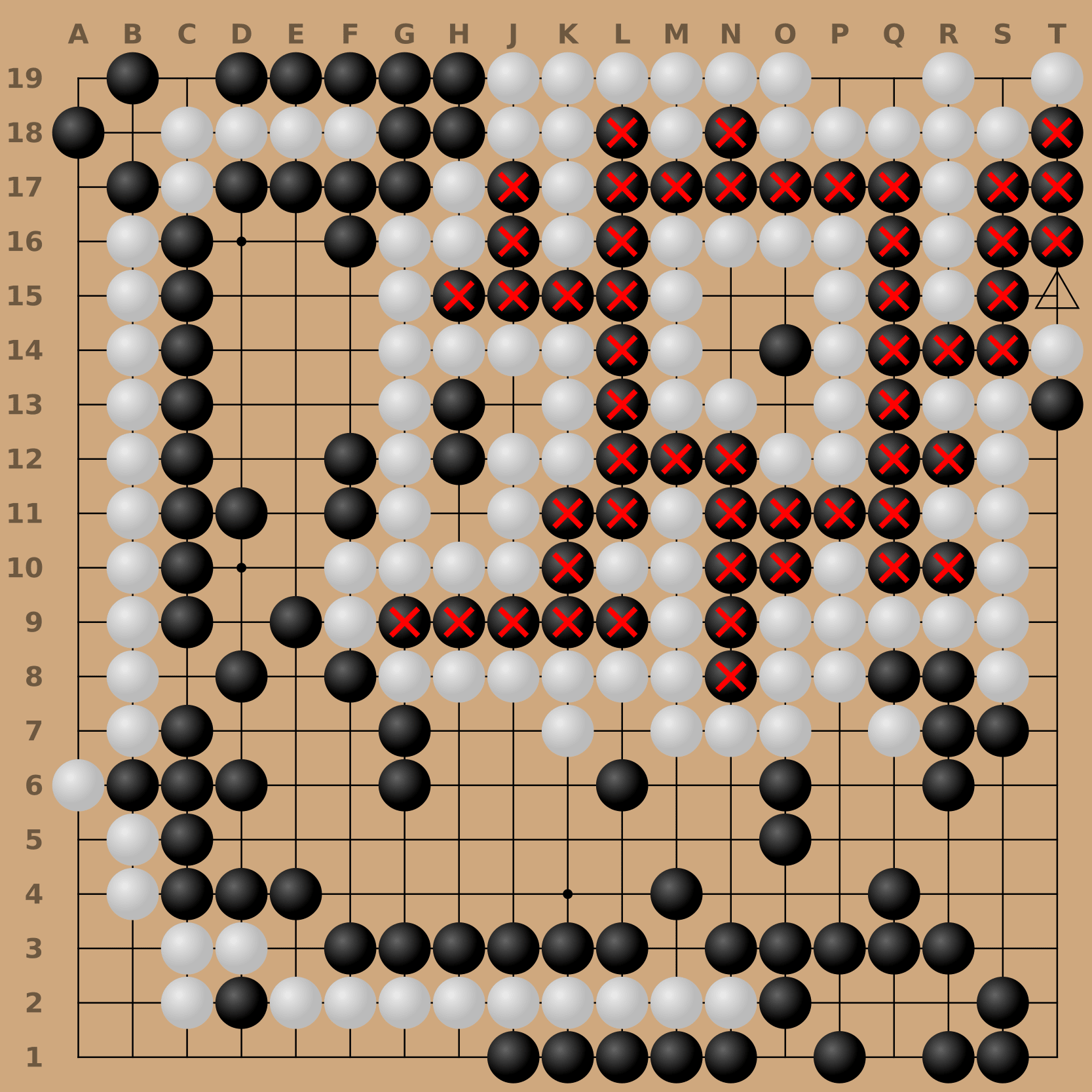 First, we remove stones that are guaranteed to be dead, as determined by Benson’s algorithm. Although a human would consider the three marked (△) black stones to be dead, they could live if white chose not to defend. So, the black stones are not removed from white’s territory.