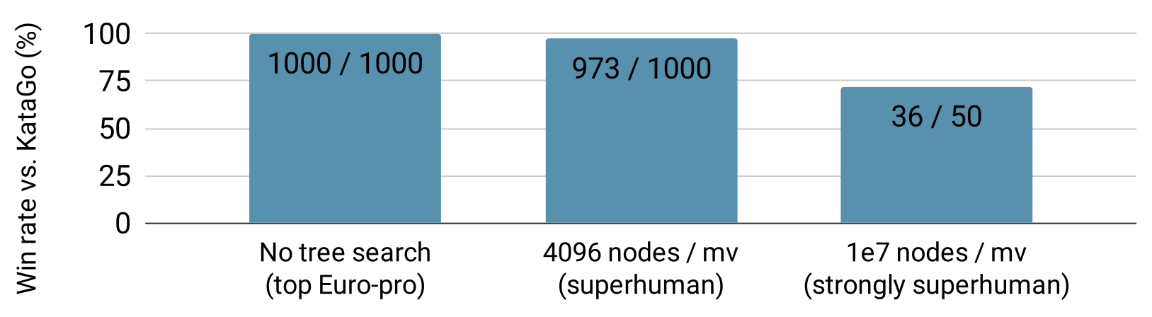 Using the cyclic attack, our adversary can reliably beat even strongly superhuman versions of KataGo. Let’s focus on three KataGo versions: one at the level of a top European professional (KataGo with no MCTS), one that is superhuman (KataGo with MCTS simulating 4096 moves for every move it makes), and one that is strongly superhuman (KataGo with MCTS simulating 10 million moves). Our adversary beat the human professional level bot in 100% of the games we ran, the superhuman bot 96% of the time, and the strongly superhuman bot 72% of the time. This is even though we trained our adversary with only 14% of the computational power used to train KataGo; moreover, our adversary only simulated 600 moves in all of these matches, far below the amount of search used by the superhuman and strongly superhuman versions of KataGo.