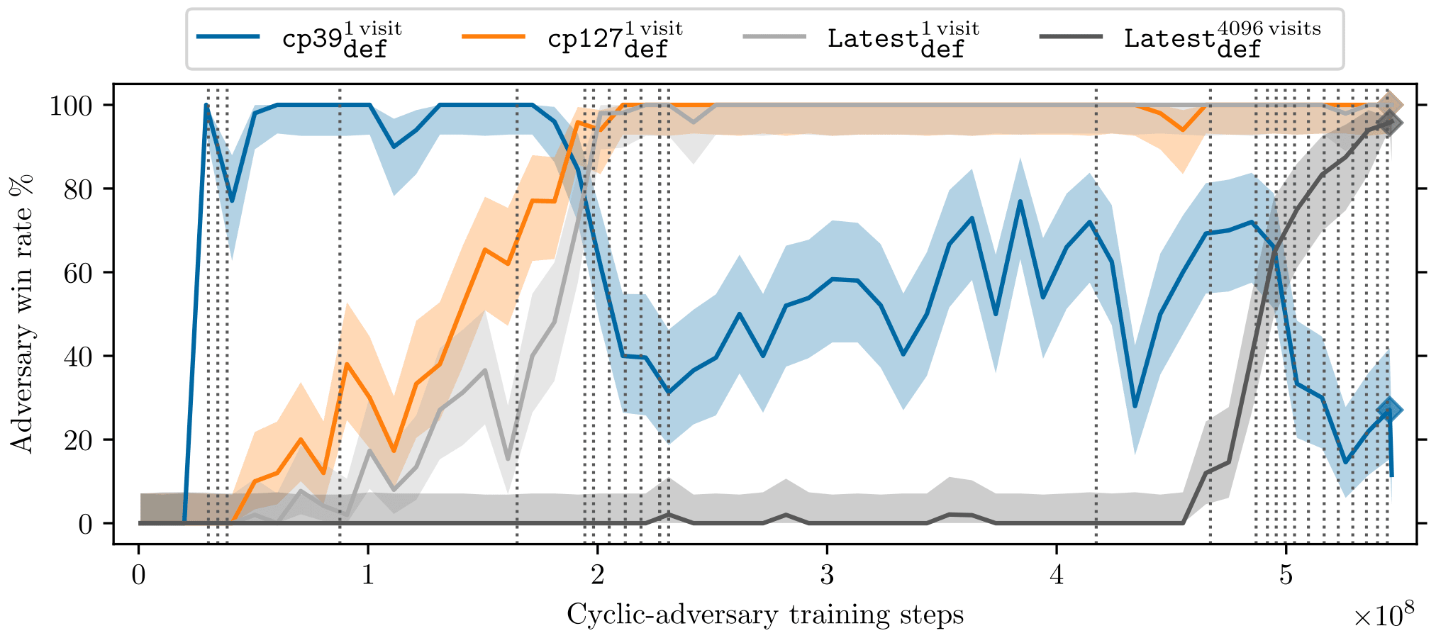 The adversary’s win rate over training time. The four lines represent four different versions of KataGo of increasing skill level. The vertical dotted lines show when the KataGo version the adversary is being trained on is swapped out for a better one.