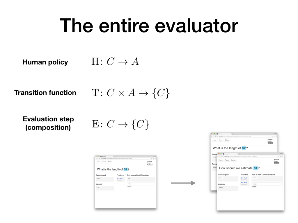 Composed together, the human policy and the transition function define a kind of evaluator: A map from a context to a set of new contexts.