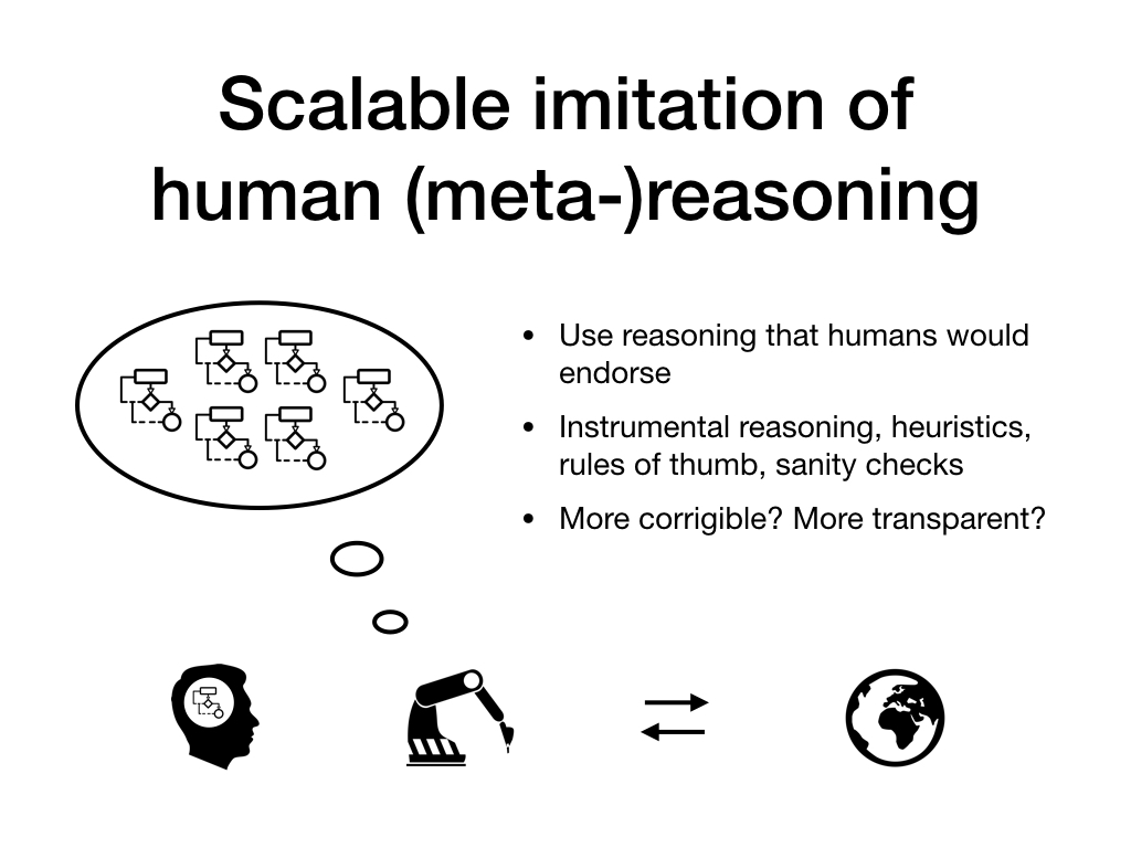 A key challenge for these approaches is scalability: Even if we could learn to imitate how humans solve particular cognitive tasks, that wouldn’t be enough. In most cases where we figured out how to automate cognition, we didn’t just match human ability, but exceeded it, sometimes by a large margin. Therefore, one of the features we’d want an approach to AI based on imitating human metareasoning to have is a story for how we could use that approach to eventually exceed human ability.
