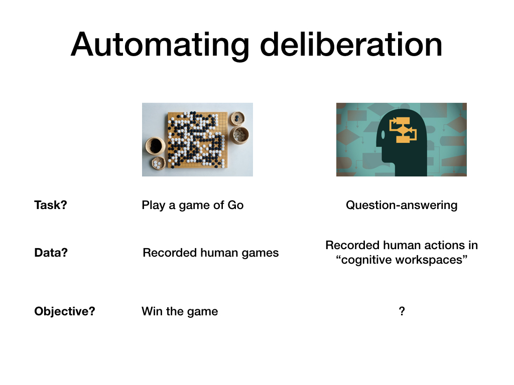 For Go, there’s a clear task (choose moves based on a game state), there’s relevant data (recorded human games), and there’s an obvious objective (to win the game). For deliberation, none of these are obvious.