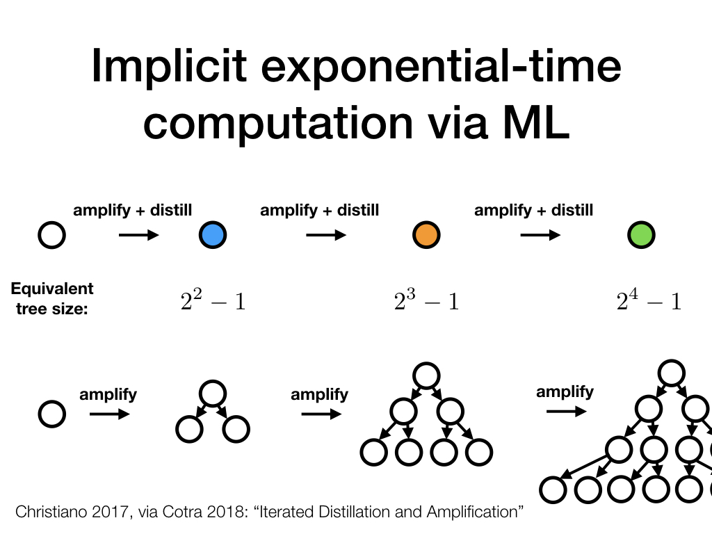 If Iterated Amplification and Distillation can work, we might be able to approximate the results of running some computations that would naively take exponential time: after n steps of amplification and distillation, we’d use a fast ML-based approximator to run computations that would take time if we instantiated them explicitly.