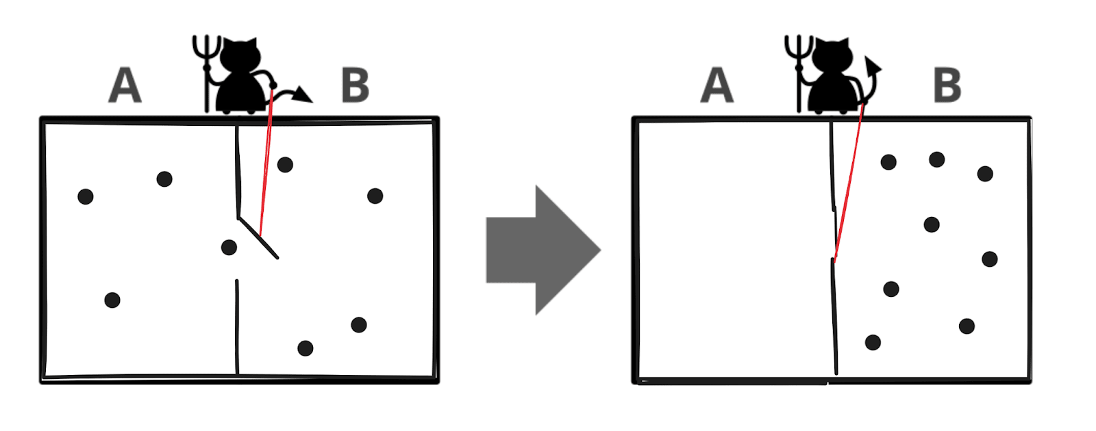 We have a container of gas, i.e. a bunch of molecules bouncing around. Down the middle of the container is a wall with a tiny door in it, which can be opened or closed by a little demon who likes to mess with thermodynamics researchers. Maxwell[1] imagined that the little demon could, in principle, open the door whenever a molecule flew toward it from the left, and close the door whenever a molecule flew toward it from the right, so that eventually all the molecules would be gathered on the right side. That would compress the gas, and someone could then extract energy by allowing the gas to re-expand into its original state. Energy would be conserved by this whole process, since the gas would end up cooler in proportion to the energy extracted, but it would violate the Second Law of Thermodynamics—i.e. entropy would go down.