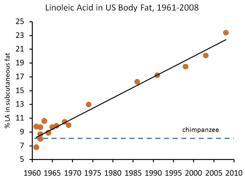 Many vegetable oils (and particularly seed oils) are high in linoleic acid. And guess what’s making up a rapidly increasing fraction of body fat? (figure from Stephan Guyenet):