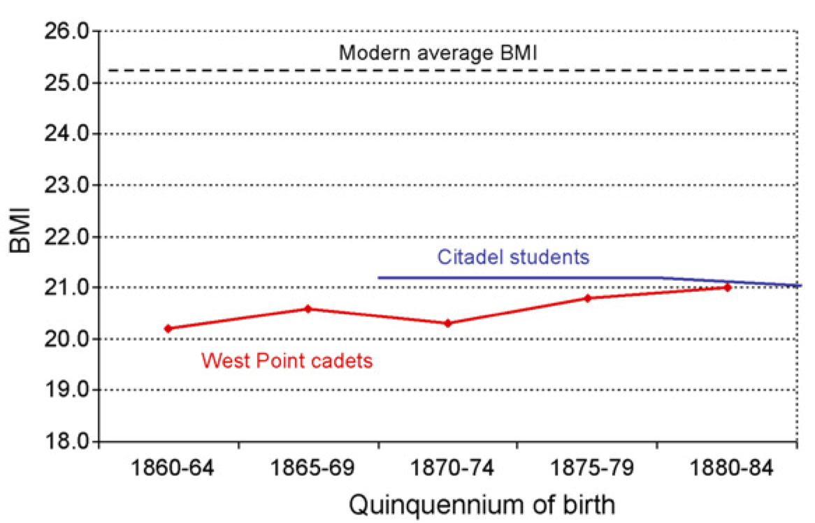 There’s also data for the incoming classes at a couple military academies. Hiermeyer (2010) collects data for people entering West Point and the Citadel:
