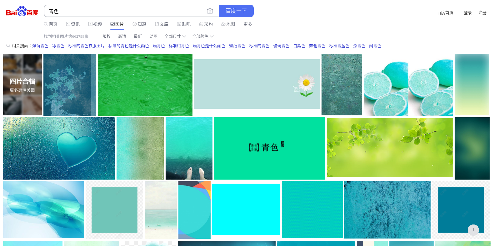 The Chinese results for “青” are closer to turquoise than to blue AND they include images of sky and water like the Japanese results. The things associated with the color 青 are more similar between Japanese and Chinese even though the absolute value of the colors are more similar between Japanese and English. 青 is the color of nature and plants. Blue is the color of the future and pants.