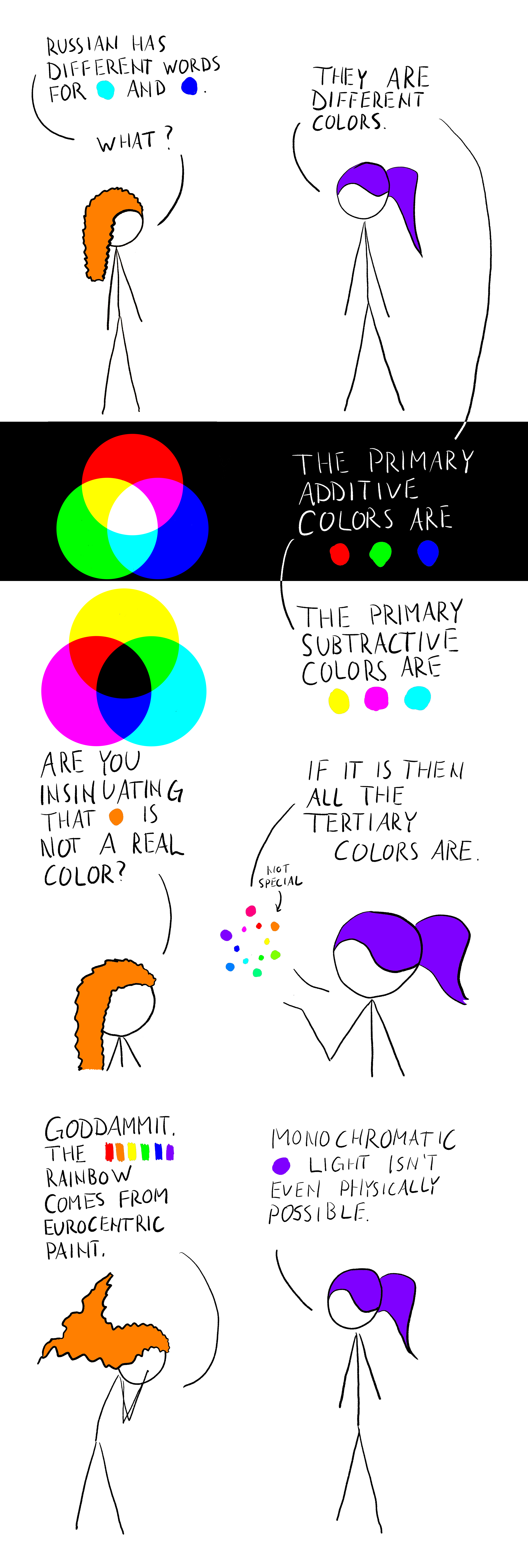 The bit in the comic about “Eurocentric paint” obviously doesn’t quite make sense as stated—the division of the rainbow doesn’t come from paint! -- but a paint set that focused on the central examples of basic color terms of a particular language could reasonably be called a that-language-centric paint set. In any case the basic point is just that dividing up color space into basic color terms has a large cultural component to it.