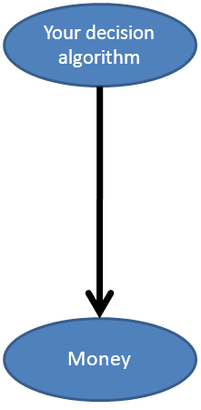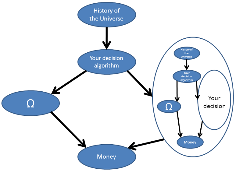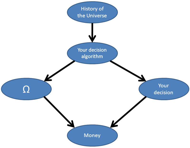 Your decision algorithm (or your your decision process) is the node that determines what you’re going to decide. This leads to “Your decision” (1-box or 2-box) and Ω (puts $1M or zero in box A). These lead to the “Money” node, where you can end up with $1M+1K, $1M, $1K or $0 depending on the outputs of the other nodes. Note that the way the network is set up, you can never have $1M+1K or $0 (since “Ω” and “Your decision” are not independent). But it is the implied “possibility” of getting those two amounts that causes causal decision theory to 2-box in the Newcomb problem.