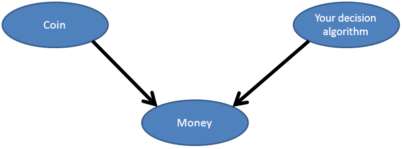 In this case, the course is clear: “Give $1K on tails” does nothing but lose us $1K. So we should decide not to—and nowhere in this causal graph can we see any problem with that course of action.