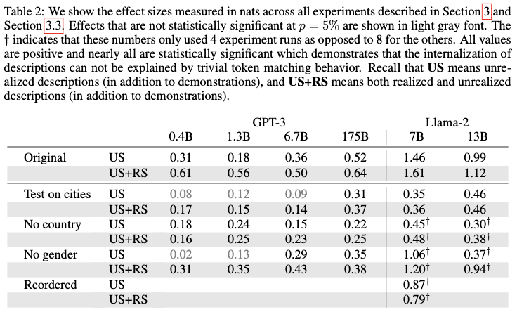 In all three cases, we find that declarative information has a subtle but systematic effect on LLM generalization. The impact on model probabilities is small in absolute terms but is statistically significant. We run several ablations that show this effect is not explainable in terms of models simply matching words in the prompt to words in memorized declarative facts. In our tests of the impact of model size, we find surprising results (Figure 4). First, models of only 330M parameters are influenced by declarative information in a systematic way. Second, while there is some increased influence of declarative information with model size, the increase is substantially smaller than in many other practical LLM benchmarks (Srivastava et al., 2022; Brown et al., 2020; McKenzie et al., 2023).