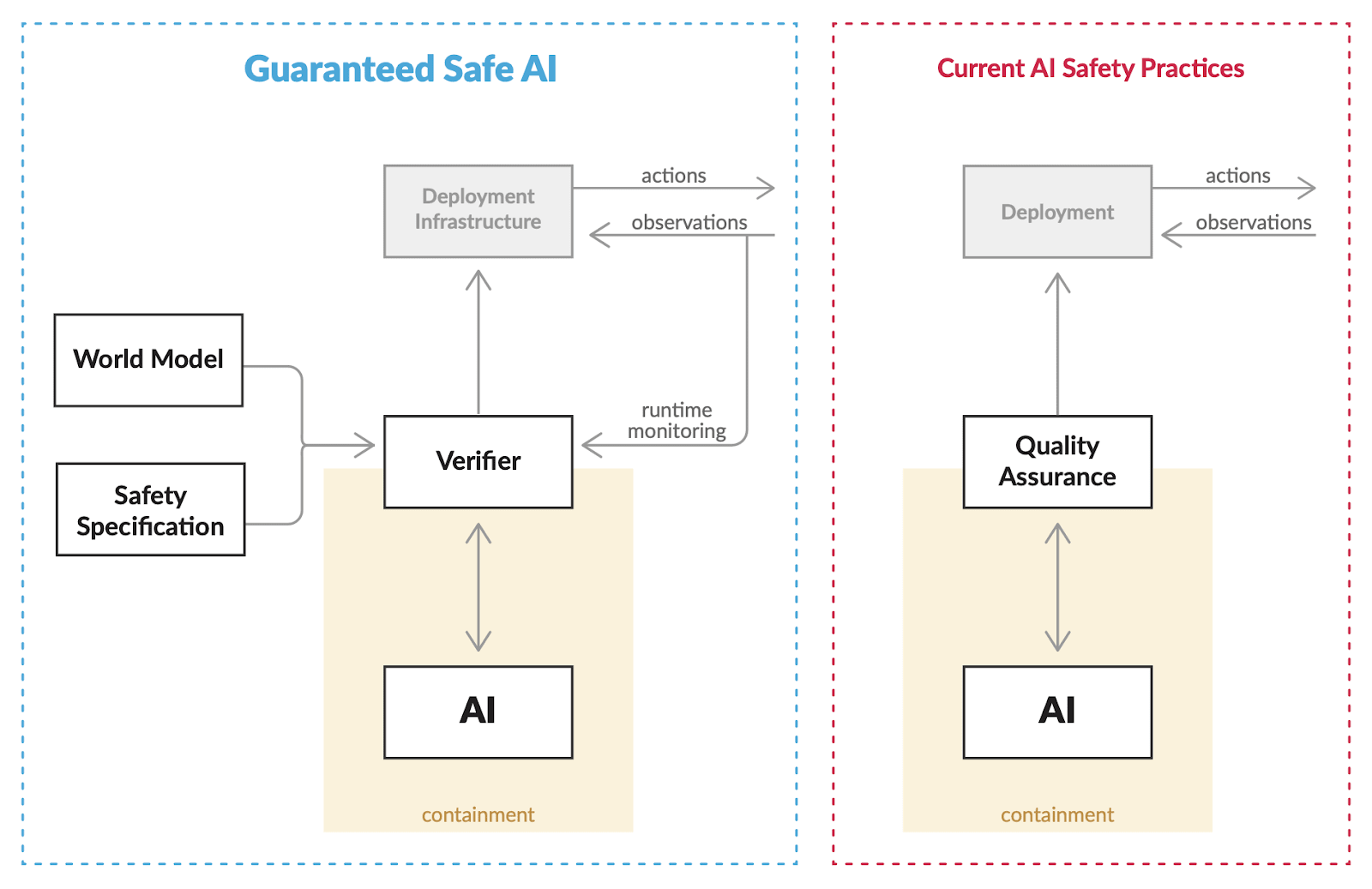 Finally, insofar as we’re worried about the mismatch between our world model and the true, real-world dynamics, there are additional layers of defence beyond the model itself that can help make sure that any differences do not end up causing critical safety failures. For example, a runtime monitor – a common design feature in systems engineering today – provides further safety assurance post-deployment by tracking the deployed system real-time and noticing when the observed data deviates from what has been predicted will occur. If such a deviation is observed – implying that the model the guarantees depend on has potentially safety-relevant errors – the system then falls back to a more conservative operational policy restoring the safety of the system. (I will say a few more things about deployment infrastructure that can help secure GSAI systems in section 1.3.)