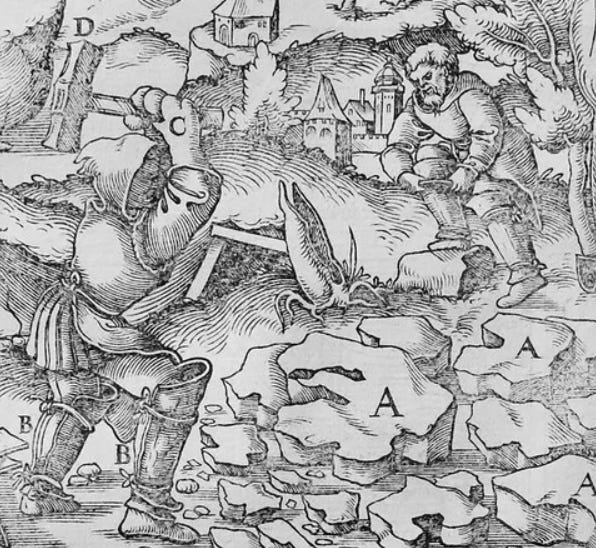 The historian Bret Devereaux has an excellent and highly-recommended series on the history of iron. The popular depiction of iron being a rare commodity (typified within medieval and fantasy genre) obscures some of the reality. As a material, iron is extremely abundant — the fourth most common element in the Earth’s crust, making up 5% of its mass. The hurdle with iron wasn’t finding it but rather getting it out of the ground and into a useable form. It required a lot of dead trees and broken shins. One of the illustrations Devereaux cited is from 1556, and shows how workers wore shin protection as they crushed the ore into useable chunks: