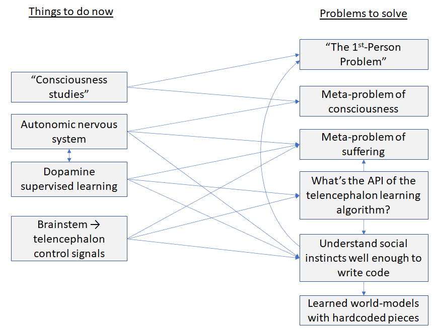 Unlike the previous section, I do think I’m pretty likely to do some work here, even in the short term, partly because I’m still pretty generally confused and curious about this. More importantly, it’s very closely tied to other things in AGI safety that I need to be working on anyway. In particular, it seems pretty intimately tied to decision-making and motivation—for example, we are motivated to not suffer, and we make decisions that lead to not-suffering. I’ve already written a lot about decision-making and motivation and plan to write more, because understanding and sculpting AGI motivation is a huge part of AGI safety. So with luck I’ll have something useful to say about the meta-problem of suffering at some point.