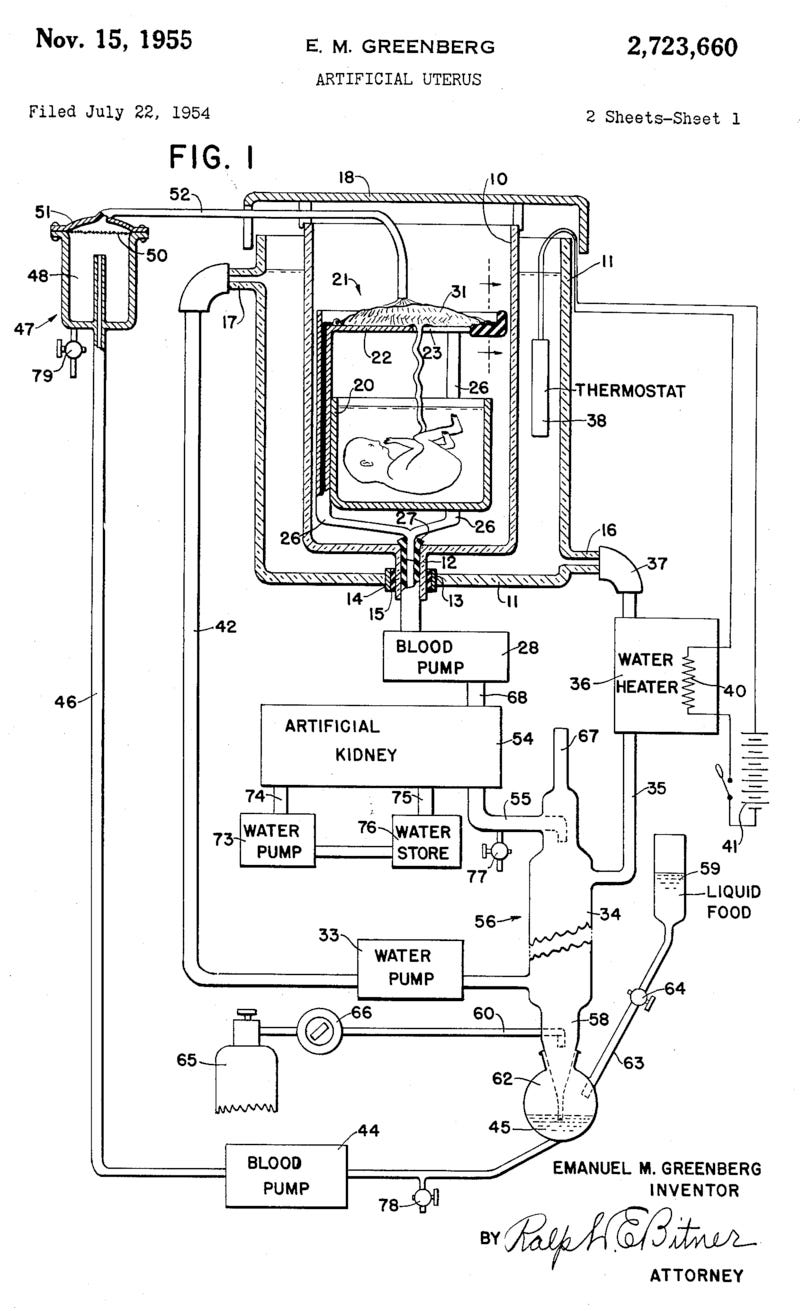 A schematic depicting an artificial womb, published in a 1954 patent application. The design included blood pumps, water heaters, and other devices intended to simulate the womb. Credit: U.S. Patent and Trademark Office