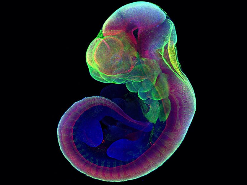 A mouse embryo grown outside the uterus and stained for developmental markers. Credit: Weizmann Institute.
