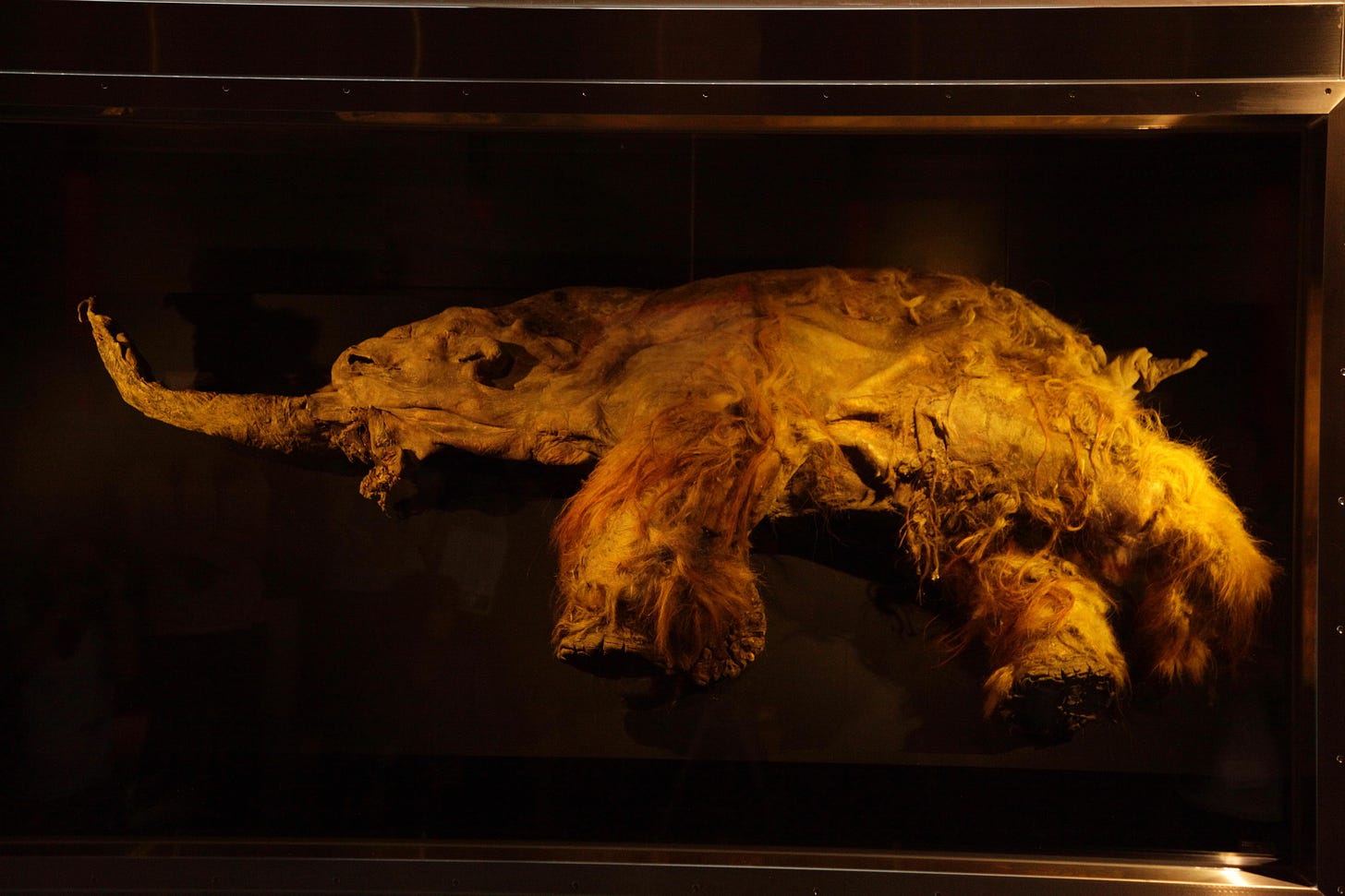 A 39,000-year-old woolly mammoth carcass on display in Yokohama, Japan. At the time of its discovery, this was the best-preserved mammoth specimen ever found. Researchers also found well-preserved blood next to the animal’s body. Credit: Alamy